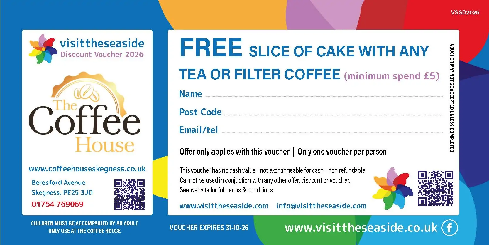 Vouchers are redeemable only at participating venues listed on Visit the Seaside. Each venue may apply additional terms and conditions, which must also be adhered to.